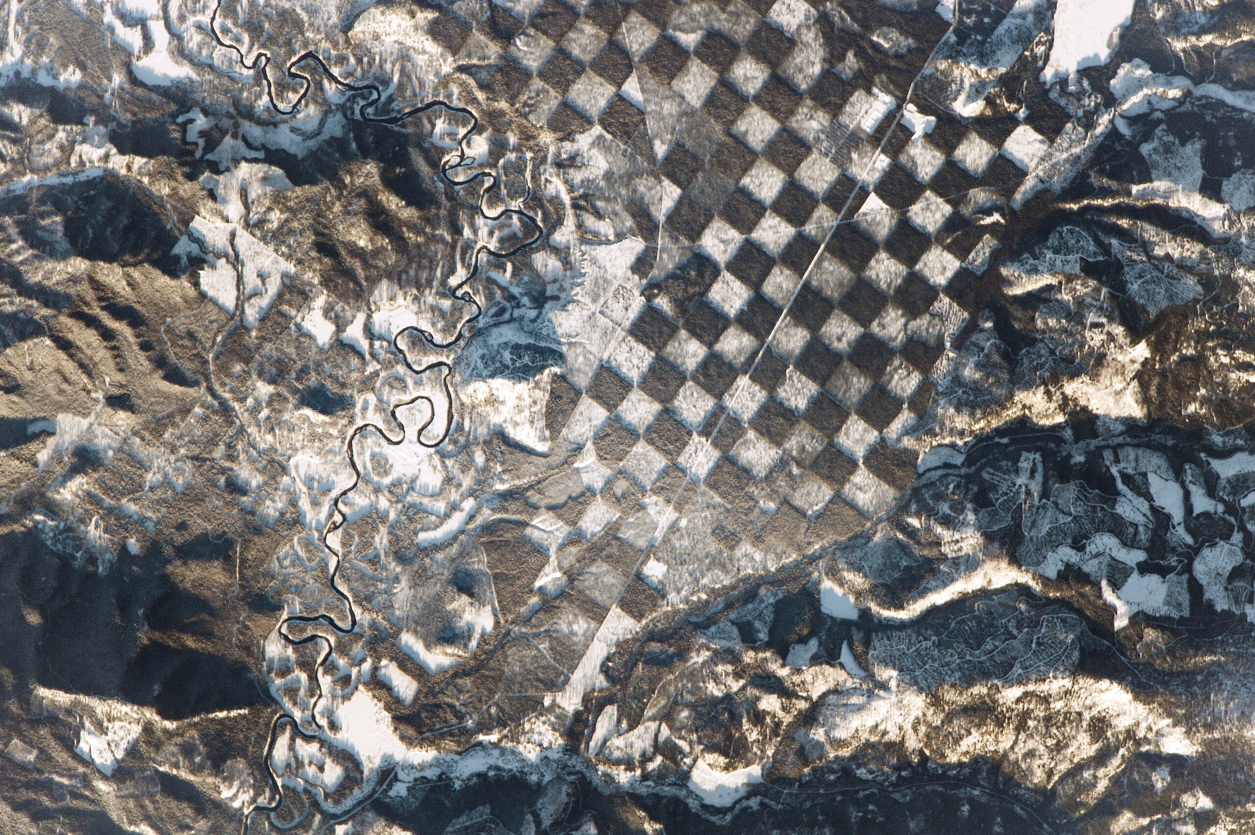 Why are some regions of the US covered with a checkerboard pattern visible from satellite images?